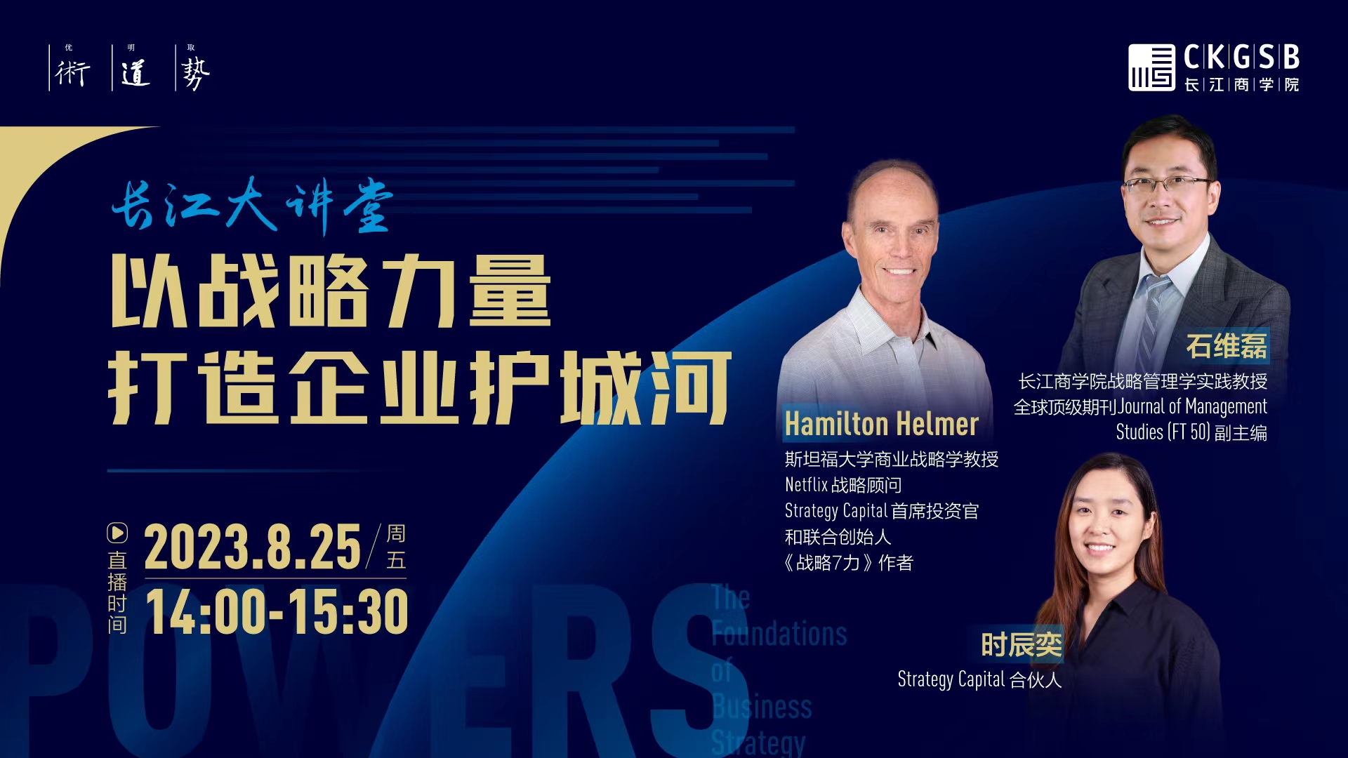 8月25日(周五)晚,长江商学院战略管理学实践教授石维磊将对话斯坦福大学商业战略学教授、Netflix战略顾问、《战略7力》作者Hamilton Helmer,Strategy Capital合伙人时辰奕,深入探讨如何通过框架性的战略思考,探寻企业长期的制胜之道。