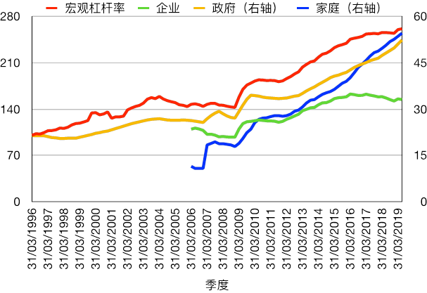 圖表11:1996年至2019年2季度宏觀和分部門杠桿率(%)