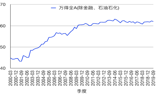 圖表13:2002年至2019年3季度萬得全A(除金融、石油石化)指數資產負債率(%)