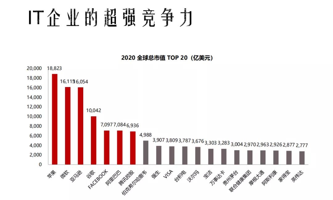 正因為IT行業的特殊性,所以IT企業都具有超強競爭力。從2020全球總市值TOP20(上圖)中可以看到,前7名都是互聯網企業(IT企業)。除此之外,前20中還有兩個非常高價值的IT企業:臺積電和英偉達。