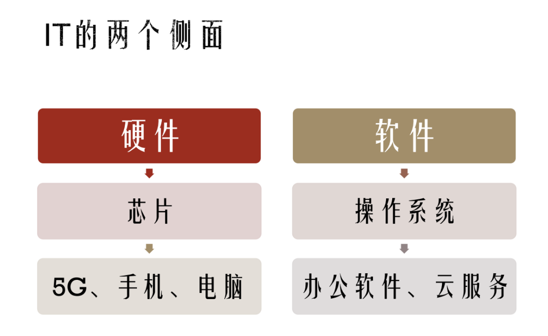 基礎層級:IT底層的架構,硬件的角度最核心的是芯片,軟件角度最核心的是操作系統。